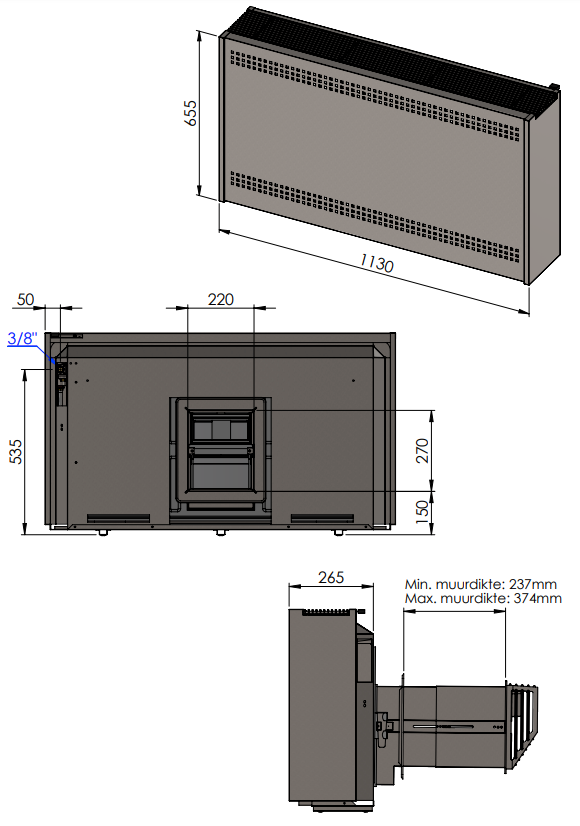 Let op: bij de radiatoren van de P-serie met gesloten verbranding wordt altijd een muurdoorvoer gebruikt. Deze doorvoer gaat rechtstreeks horizontaal door de buitenmuur, waarbij een concentrische buis met een diameter van 100/150 mm niet mogelijk is.