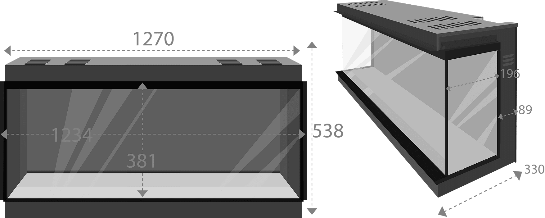 • 125, 150 en 200 cm uitgevoerd met een achterwand die schuin wegloopt. Wanneer je een van deze haarden in een hoek of 3-zijdig inbouwt heb je van de zijkant meer zicht hebt op het vuur.