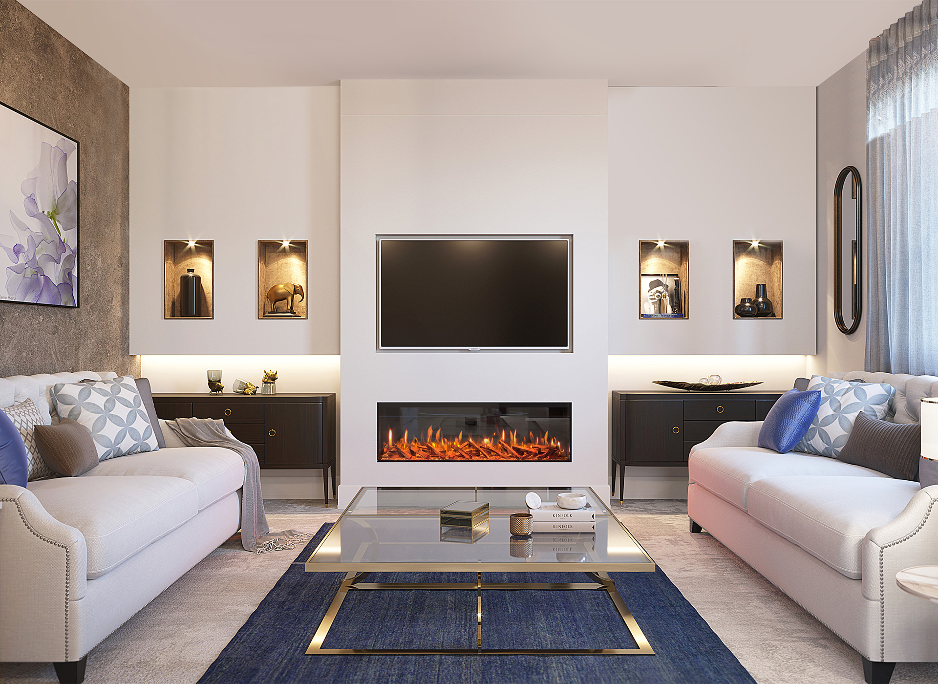 • Veelzijdig Ontwerp: Pas je haard aan aan je voorkeuren met drie verschillende installatieopties: frontaal, tweezijdig of driezijdig. Ongeacht je ruimte, integreert onze haard naadloos in je interieur en voegt een vleugje elegantie en warmte toe.