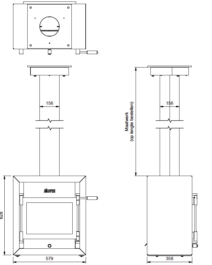 Standaard wordt de kachel vast aan het plafond gemonteerd. Wilt u de kachel 360 graden laten draaien? Dat kan! Zie de extra's voor de meerprijs hiervan.